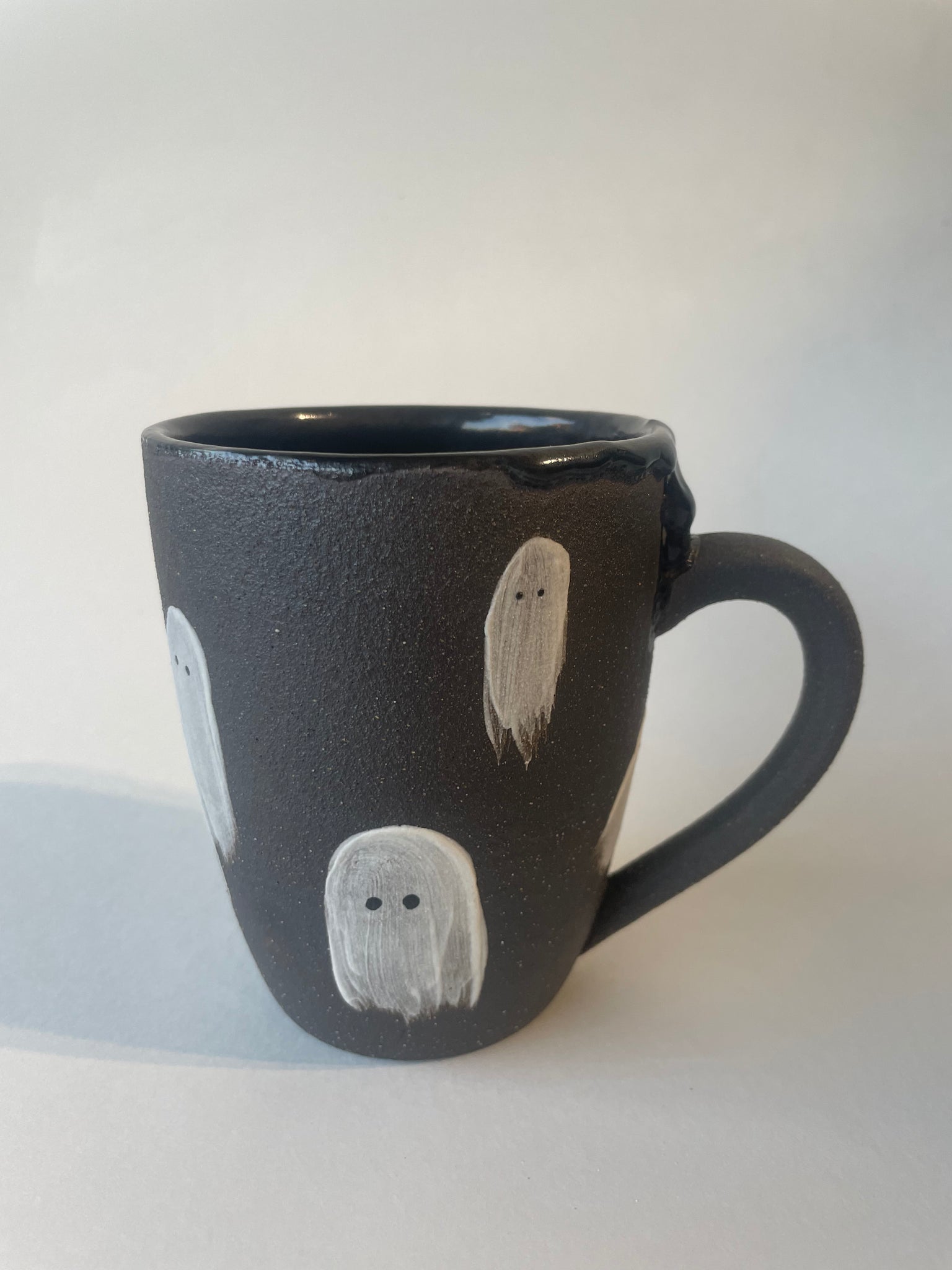 Large mug with black drippy glaze and raw clay exterior+ghosties! One of a kind!